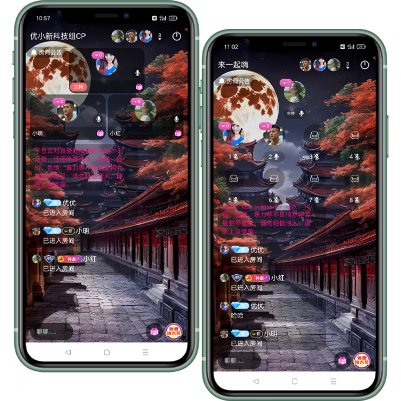 语音派对房间,1个主持麦,8个嘉宾麦,CP房间,一个主持麦,两个嘉宾麦,一个男嘉宾,一个女嘉宾。