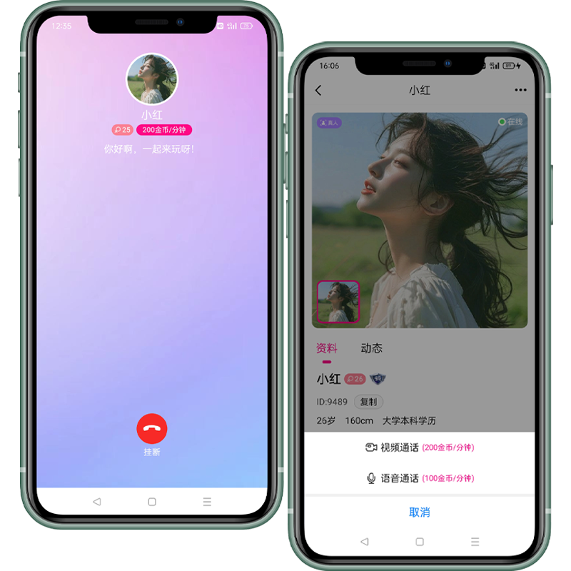 - 点击呼叫按钮,可选择视频通话或者语音通话,通话每分钟价格是主播自己设置,通话中男女嘉宾也可相互送礼物。