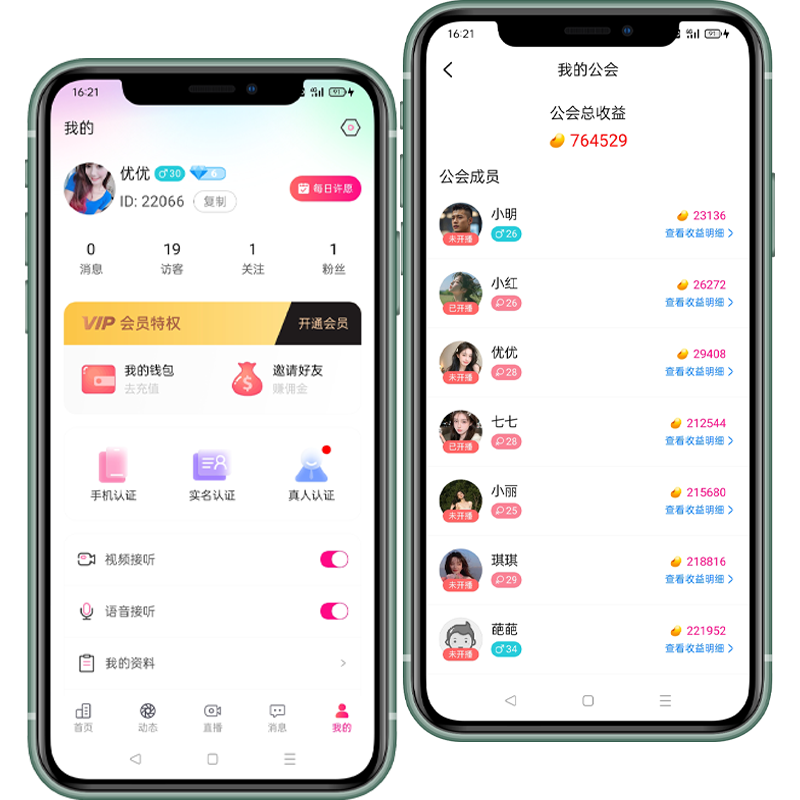我的公会,展示我的公会成员列表,公会成员开播状态,收益情况,点击公会成员进入详情页面,展示公会成员的收益明细,可按天统计或按周统计。