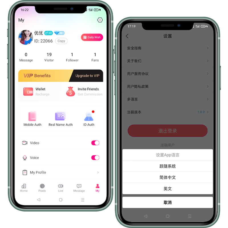 - 在应用内可切换不同语言版本,我的->设置->切换多语言,也可选择跟随系统。