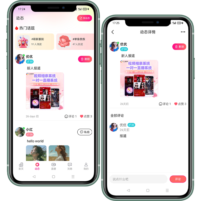 - 动态详情,展示动态内容,图片或视频,点赞,以及评论列表。