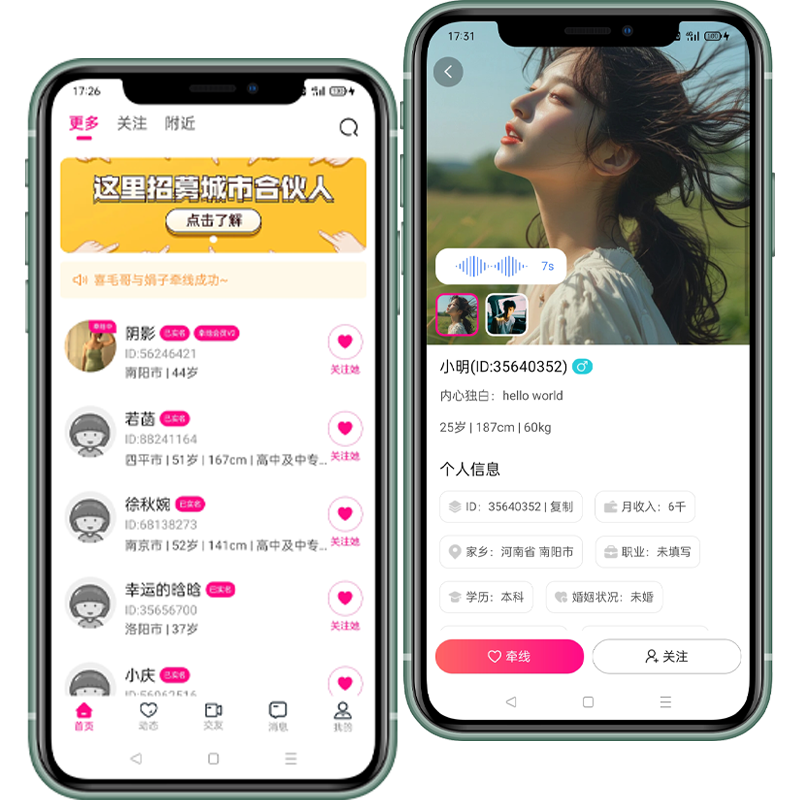 红娘牵线系统,首页推荐用户列表,关注列表,附近用户列表,点击用户跳转到用户详情,展示用户详细信息,个人信息及认证信息。