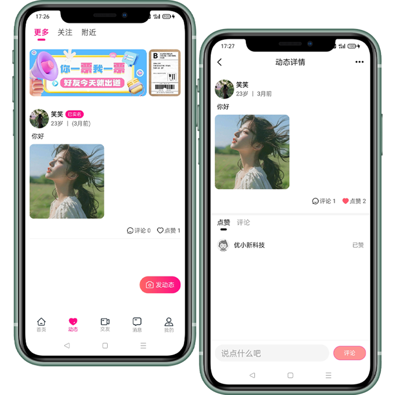 - 动态详情,展示动态内容,图片或视频,点赞,以及评论列表。