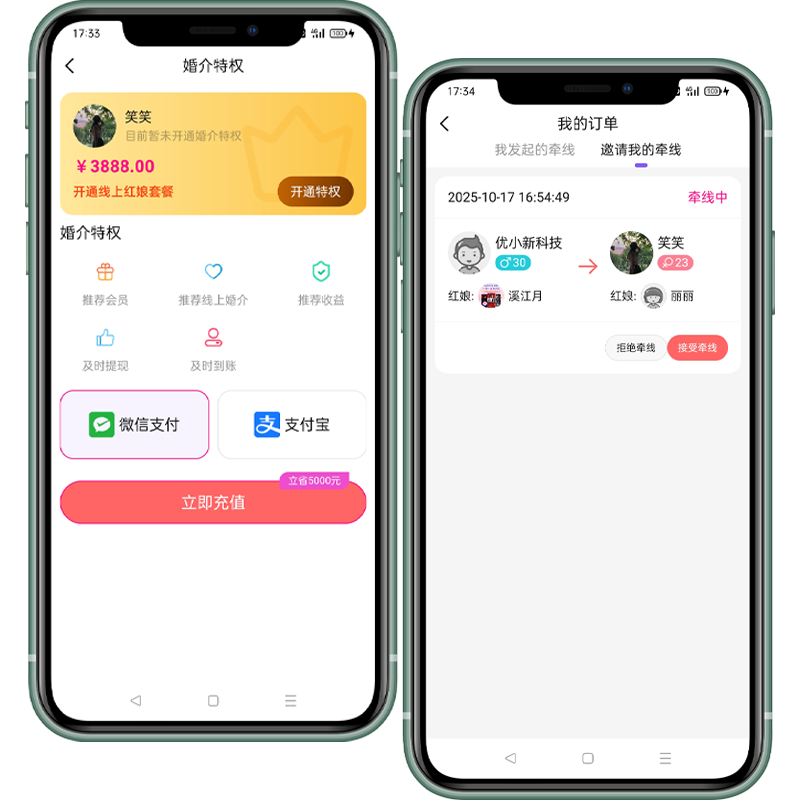 - 点击牵线按钮,申请牵线(购买牵线会员),对方会收到牵线申请信息。