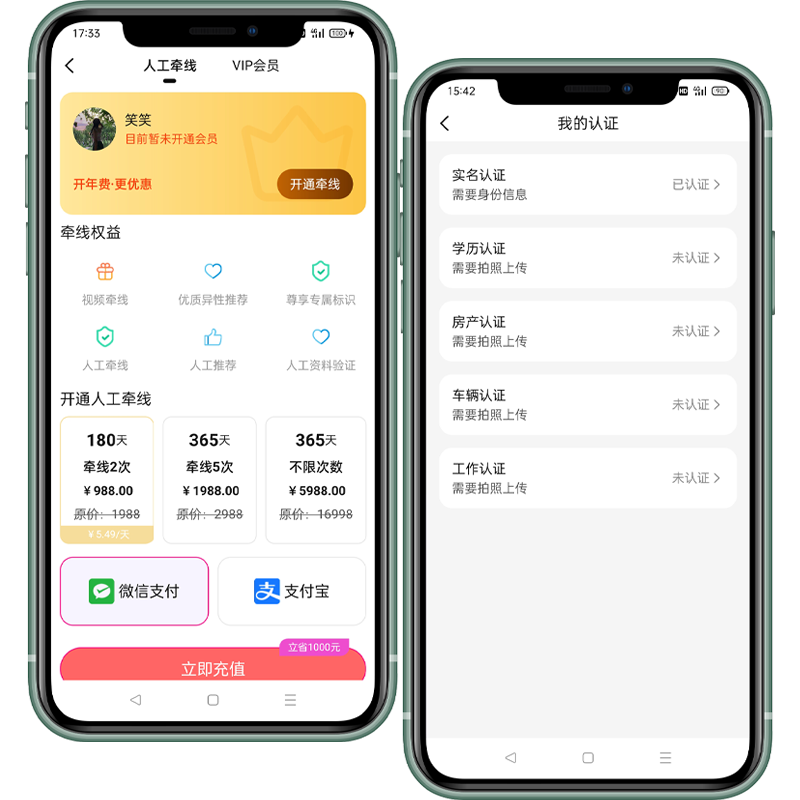 人工牵线会员和VIP会员,是平台主要的盈利点,该功能为用户提供了牵线次数,专属标识,优质异性推荐等服务。