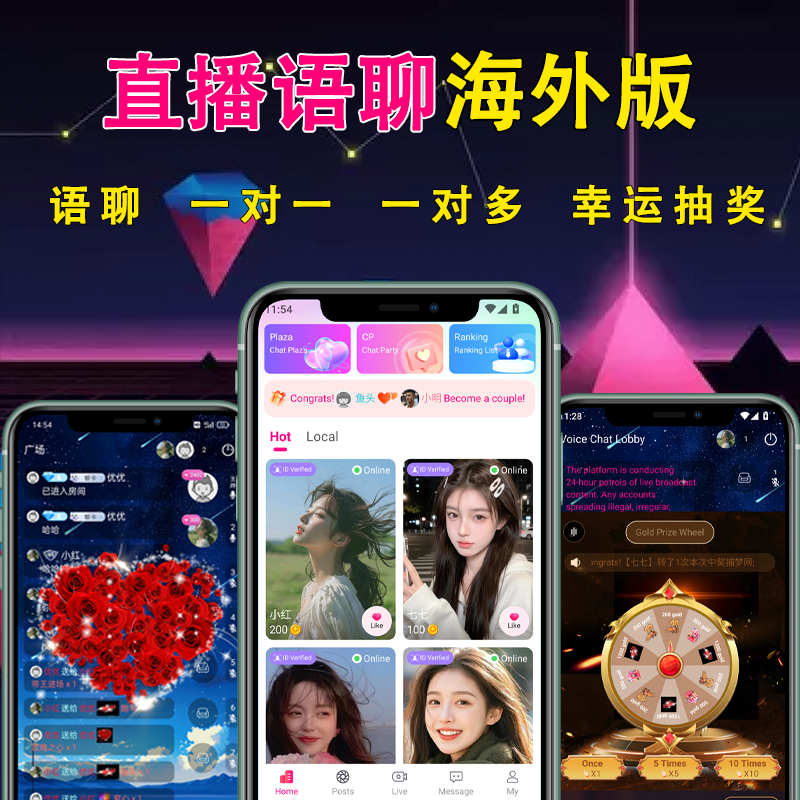 一对一直播海外幸运抽奖礼物语聊房app海外源码语聊软件源码。